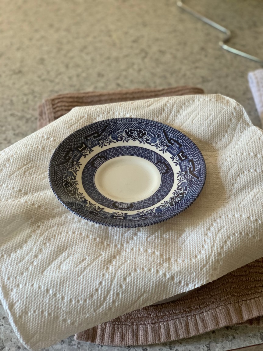 Before removing the cake from the cake pan, and you should do this as soon as you take it out of the oven, I use a little trick to flatten the top of the cake. This makes it easier when stacking the layers. I put a paper towel on top of the cake and then put a small saucer on top and flatten it just a little. Then just turn the pan upside down and the cake should pop right out. I put them each on a plate with a paper towel under them so they can cool completely.