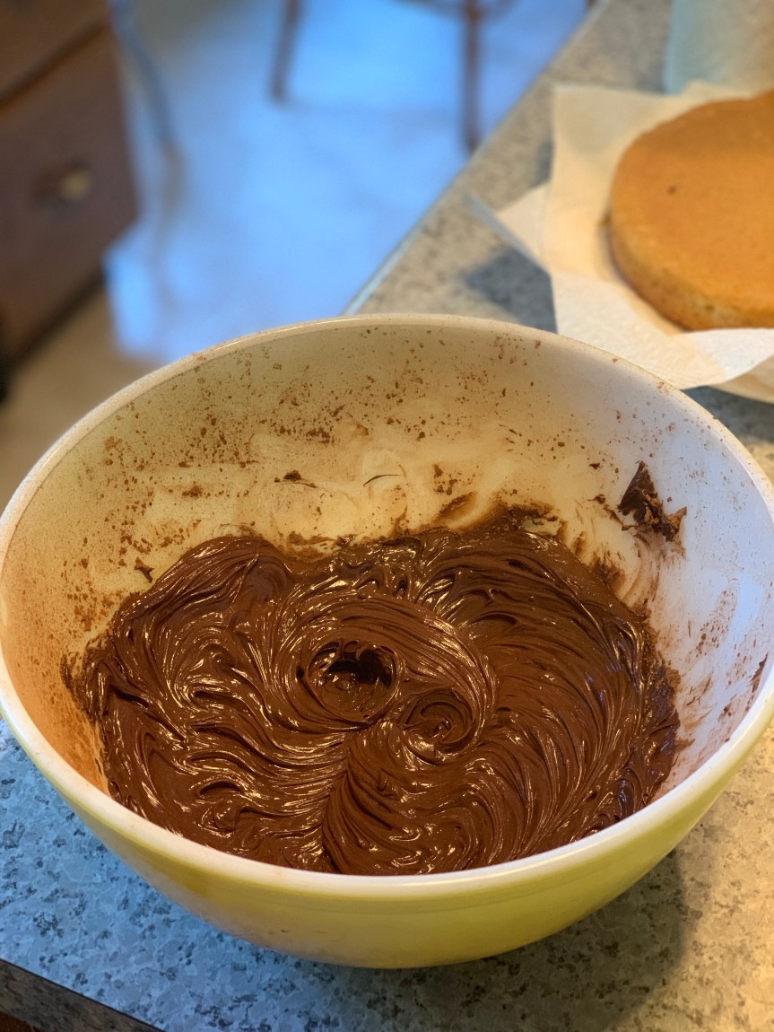 When you put the icing on the first layer don’t worry about crumbs getting in the icing. You are going to cover up that first layer with more cake and more icing.
