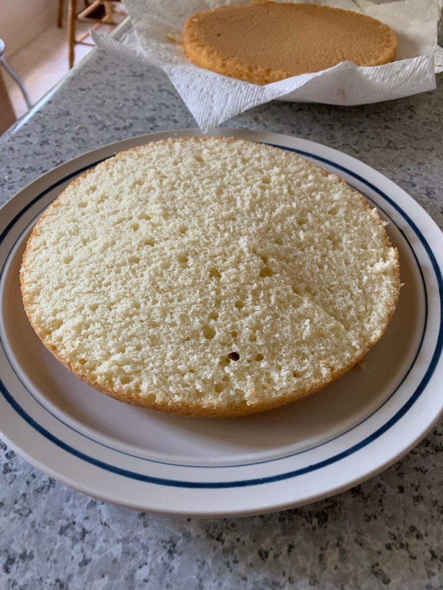 Turn the cake upside down if you didn’t split the cake this will be the bottom. This makes your cakes stack a lot easier whether you are doing two or four layers.