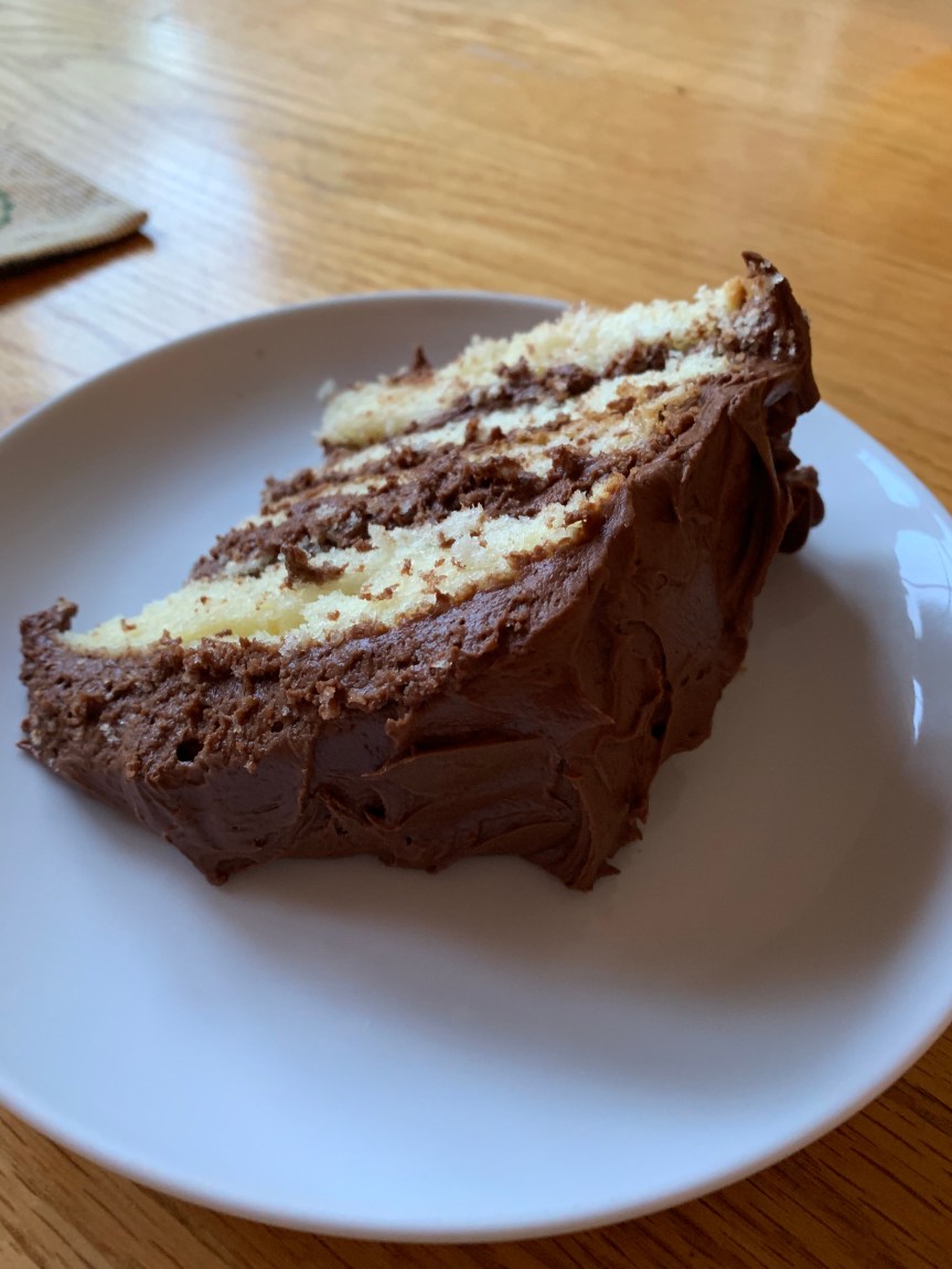 And the finished product. You can swirl the icing a little and use a pastry bag and an icing tip to pretty up the edges, but you don’t have to it’s going to be yummy anyway.