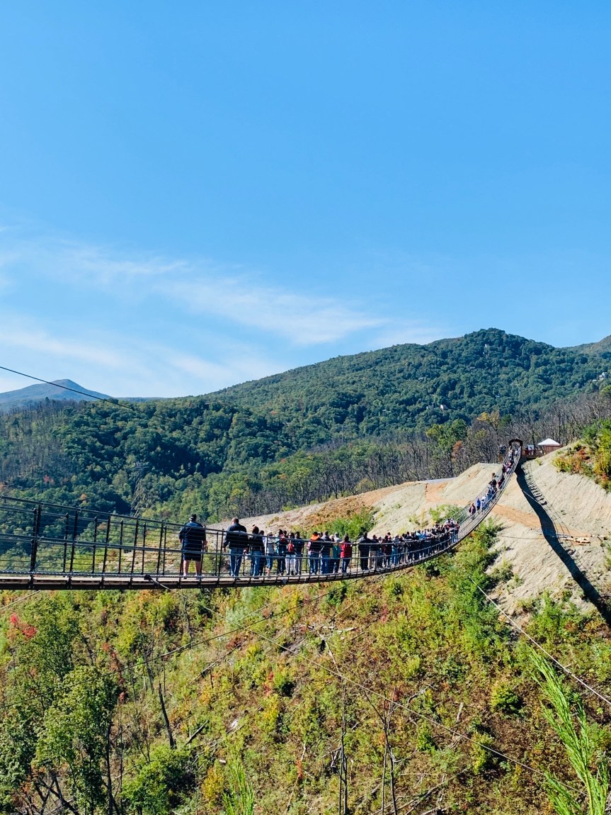 Several years ago a terrible fire burned much of Gatlinburg including homes and attractions. The top part of the SkyLift burned pretty bad. The SkyLift was closed for quite a while. But what happened when the rebuild started was quite a thing to behold. A suspension bridge was installed on the top of the mountain along with a SkyDeck that allows you see for miles. The SkyBridge is 140 feet high at its midpoint and 680 feet across and is the longest suspension bridge in North America. You begin by riding the SkyLift to the top of the mountain.