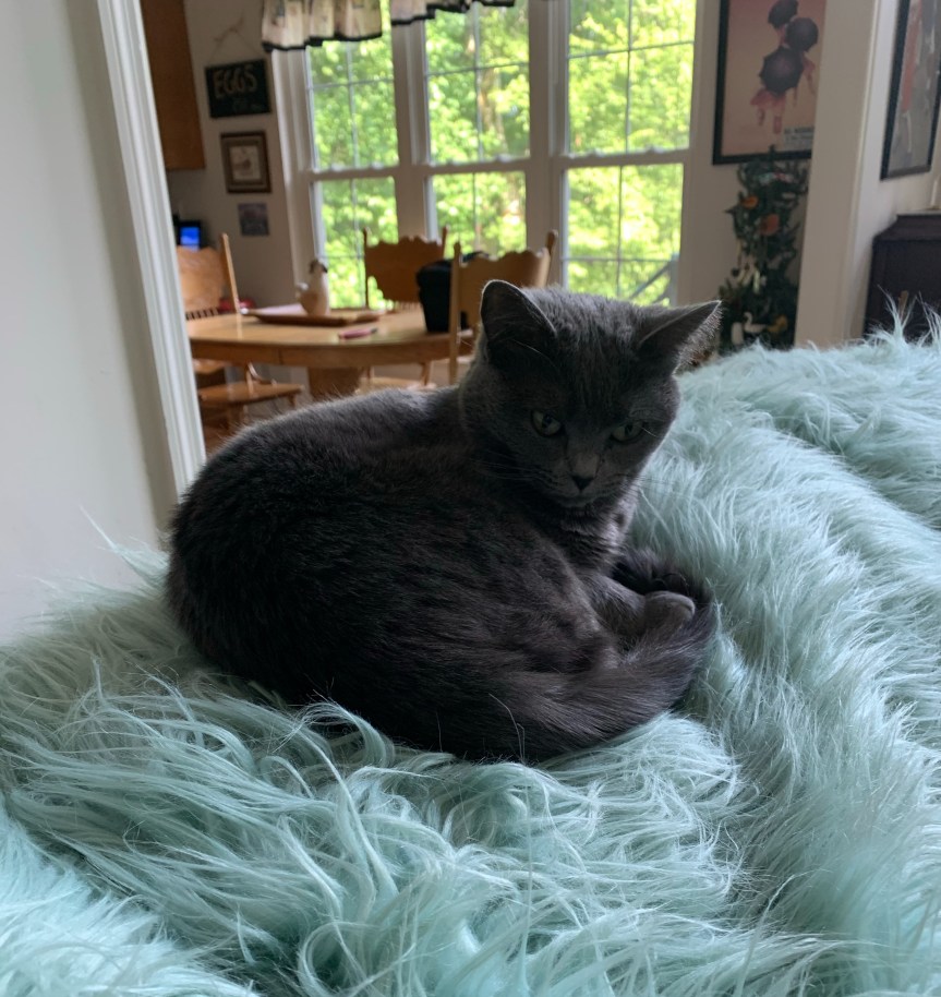 I started my search for the yarn early Sunday morning.  I have a den upstairs where I keep most of my knitting and sewing supplies.  I looked through the closet in the den.  Well when I say I looked, I opened the closet doors and peered in.  I poked around a little to see if I could locate the balls of yarn I was looking for. Well actually I was hoping the yarn would mysteriously fall out of the closet and into my hands. No such luck.  Kitty Kitty had a wonderful time jumping into the closet and clambering over every basket of fabric and yarn and everything else that was in there.  I will admit the closet is pretty stuffed.  I am almost embarrassed to tell you how full it is.  It contains mostly “stuff” from projects that have been abandoned for one reason or another over the 20 years we have lived in this house.  Some of the things in the closet I had totally forgotten I had.