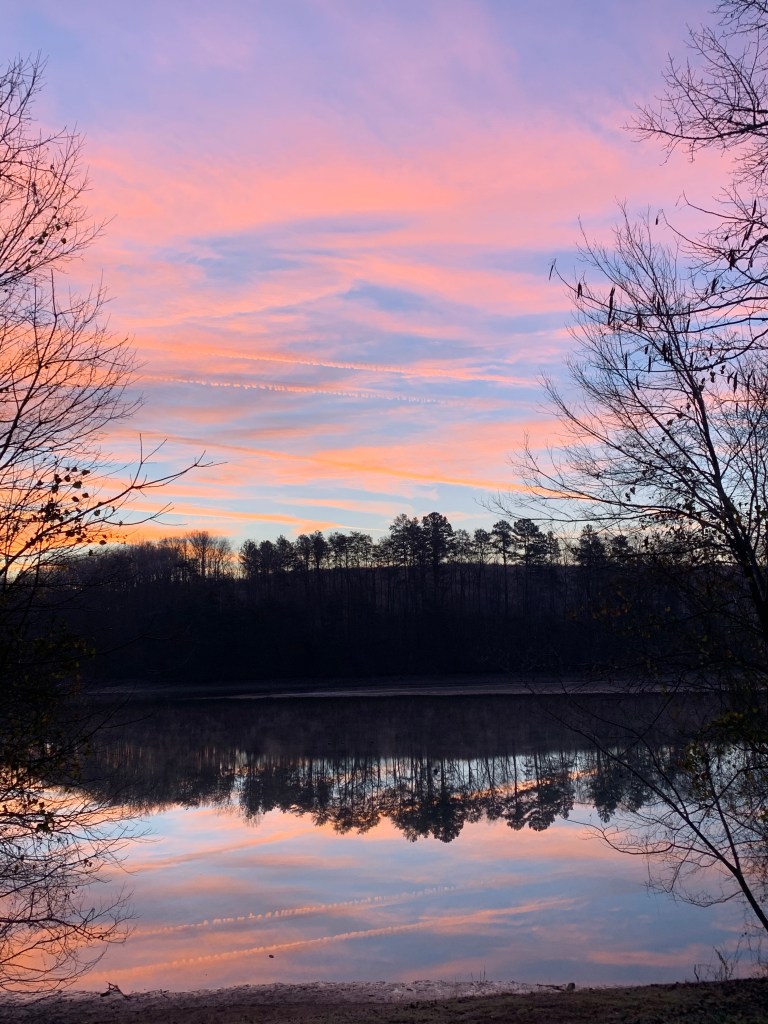The other morning I woke up rather late and as I was walking down the stairs I looked out at the lake and the most beautiful sunrise was happening. I grabbed my camera and ran out the door in my pajamas. Scruffy was right on my heels although he looked a little confused as to why we were going all the way down to the lake. The skies were red and a perfect reflection on the lake. If you turn the picture upside down you can hardly tell which is the reflection. Only the growth from the tree branches give it away. I went back in after getting a few pictures and my husband is just shaking his head. It’s only 27 degrees you know that. I really hadn’t noticed. He just shook his head, he is used to my wild racing around to capture the perfect picture.
