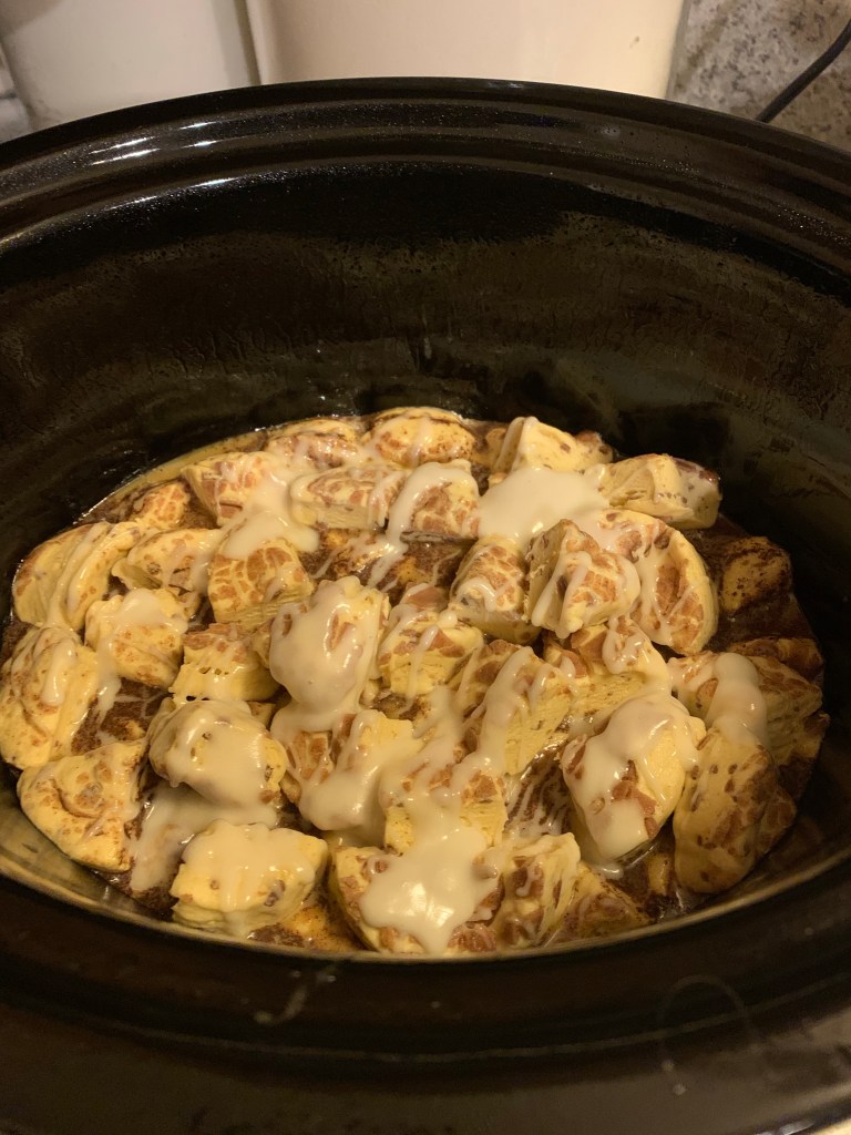 On Wednesday I had an early morning dental appointment. I had also promised my co-workers that I would make some of the cinnamon roll casserole that has been going around Facebook and TikTok. I wanted to make it on a day I was working so it wouldn’t be left at home. It is ahhhhhmazing!!!! I put it in my crock pot at 5:15 and it takes 2.5 hours to bake. You should try it.