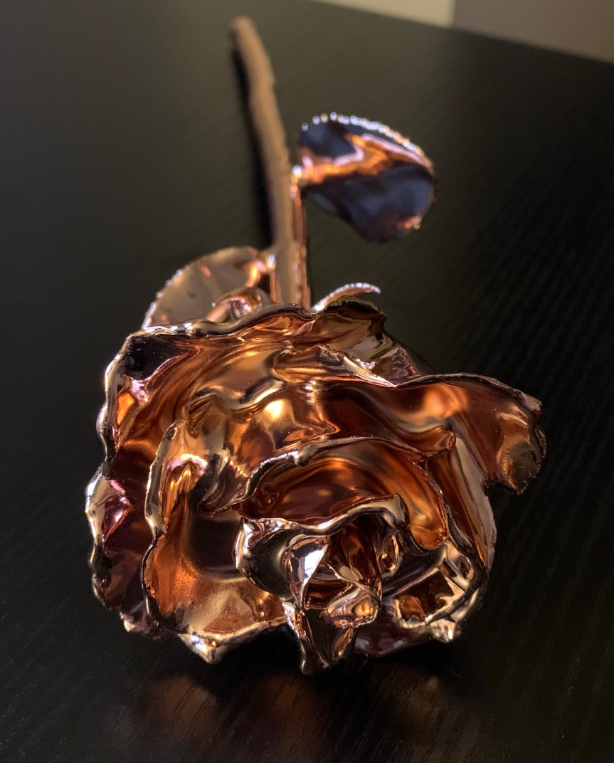 We really don’t go all out for Valentine’s Day. I put out a few decorations last week. We don’t really do gifts or anything. I usually get flowers. My husband always likes to think of different things or things that are unusual. When I opened the box he got for me I knew it wasn’t flowers or so I thought. But it was. It was a real rose dipped in 24k gold. It’s beautiful and I love it.