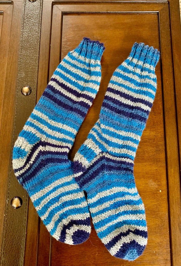 I was off today and I finished the blue striped socks I had been working on. And guess what? I had just enough yarn and didn’t have to add another ball. YAY!!!!! But man I was sweating it. I tried knitting faster and of course that didn’t help a stitch is a stitch no matter how fast you knit.