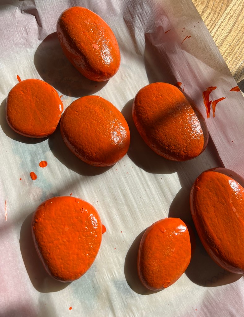 I gathered these rocks out of the flower bed last week. As I saw one that I thought would make a good pumpkin I would add it to the collection I had on the entry table near the front door. Mark kept asking what I was going to use all the rocks for. I said they’re not rocks they’re pumpkins. I had to put numerous coats of the orange paint on them and let them dry in between. I think they turned out pretty well, just time consuming.