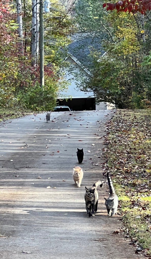 I took Molly and Scruffy for a walk on Saturday and when we were almost at the top of the driveway I looked back and saw the Kitty Parade behind me. That’s Mama, and Buster in the front followed by Milo and then Sadie and little Izzy in the back. I guess they wanted to go on the walk too.