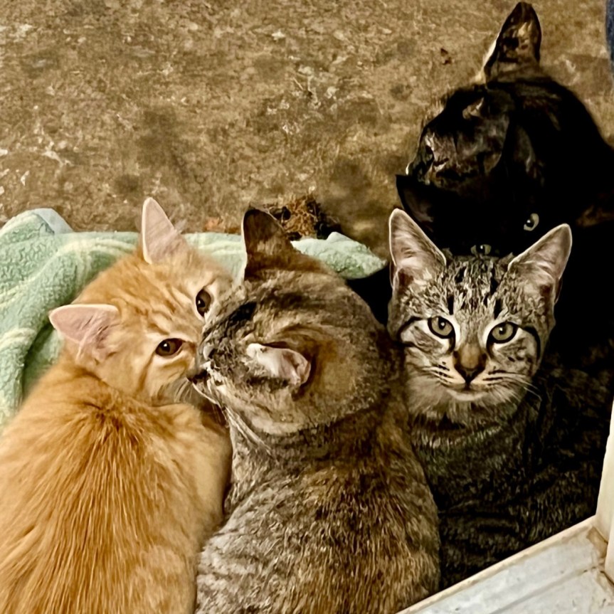 All four kittens and mama cat. You can only see Sadie’s eyes.