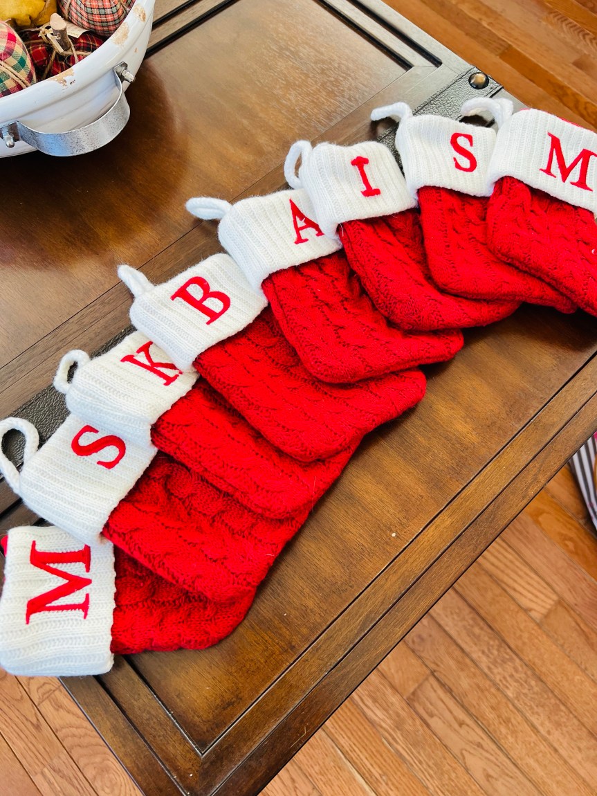 A couple of weeks ago I found these adorable little Christmas stockings at Kohl’s. I found one for each of the fur babies with their initials. All but I that is for Izzy so I bought a plain one and embroidered the I myself. I hung them up last weekend and I just love them. I have most of the ornaments on the tree except all of our Star Trek ornaments and a tree topper. I am looking for a different topper this year.
