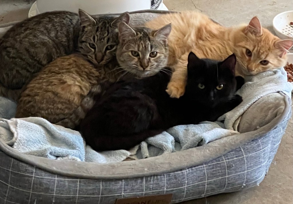 On Sunday it rained and it was quite cozy and warm in the house. The kitties were all in the garage snuggled up but not in the new kitty house. They love being together on this old bed.