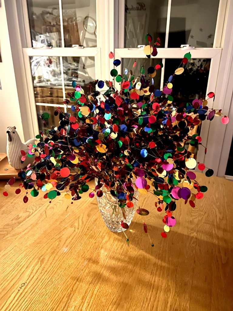 It was a rather quiet weekend here. I did the grocery thing on Saturday and went to one of my favorite thrift stores. I didn’t really find a lot at the thrift store but I did find this unusual bouquet of colorful thingies. That is the only way I know how to describe it. But isn’t it pretty. I think it looks so festive for the holidays so out of control and pretty. I don’t think my husband agrees but that is ok. I’m wondering if I might not be able to use it for my Christmas Tree topper. I am still on the hunt for the topper for this year. I wanted a moon but couldn’t find the right one. A girl at Walmart suggested a hat. Not like frosty the snowman’s hat but a real hat hmmmm, that had me thinking of course.