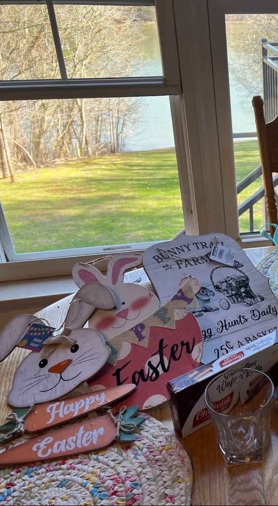 My niece had also come up to visit with my sister and she and I went to a nearby Chinese restaurant, that we love, and had a late lunch. I also went to the Dollar Tree near the hospital. I guess you know the Dollar Tree is now the Dollar and twenty five cent tree. I still think they have a lot to offer. I wanted to pick up a few decorations for an Easter basket I am making. This particular Dollar Tree has a lot more than our local one does. I found some really cute things. They had lots of Easter goodies. When I got back into town I went to visit my MIL in the assisted living village. It wasn’t much of a visit, I was so tired from being up most of the night before and on Saturday that I started falling asleep while we were visiting. I felt horrible but she understood and told me I should go home and take a nap. On my way home I went by the post office. I had ordered some new rugs for my bathroom and I wanted to pick those up. I got home and walked and fed all the babies and then I was pretty much useless. I tried watching the new Amy Shumer series on Hulu, Life & Beth, but I just couldn’t stay awake.