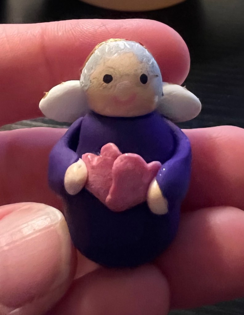 When my sister passed away her neighbor and friend made me and my sister a “Pat” angel. She gave it to us at the funeral and I put mine in my pocket and didn’t open it until after the funeral when me and hubs started home. I looked at it and and I couldn’t believe that she had so perfectly captured something about my sister in this little angel. My sister wore a purple sweater a lot of times when she was sitting outside at the apartment complex where she lived. The angel is made of clay and it is perfect. It has brought me such peace having it with me. This sweet lady makes lots of things from clay especially animals. She has made clay animals of all of my cats. She is so talented.