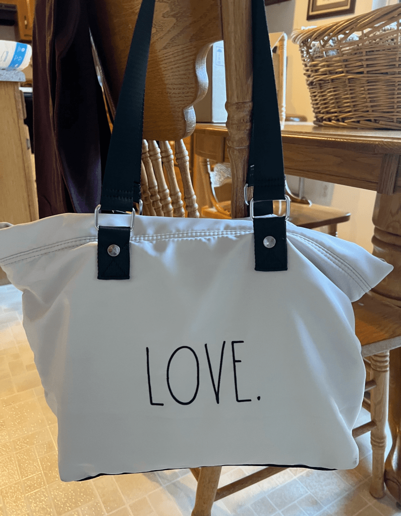 A few weeks ago I bought this Rae Dunn Love tote, although I carry it as a purse. It is perfect for me. It’s large and I can carry everything I need in it. I bought it at TJ Maxx I think it was about $35.00 so I didn’t pay nearly what it is listed online. It looks white but it has a tinge of pink to it.
