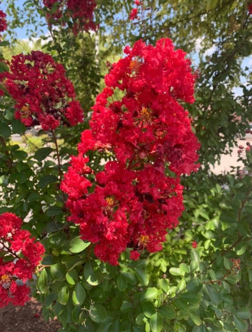 And just look at these beautiful Crape Myrtle blooms. The trees are blooming everywhere. This one is in town near one of our local banks and I just love this color.