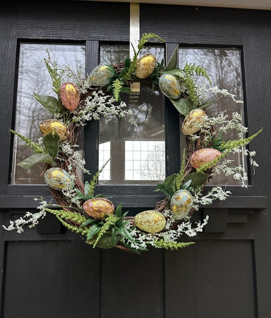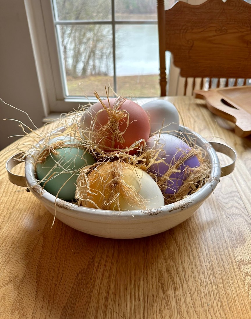 Several years ago I made decoupaged Easter eggs with two ply napkins, plastic eggs and Mod Podge I bring them out every year. Here is the how to on making them if you are interested. Making Decoupaged Easter Eggs.