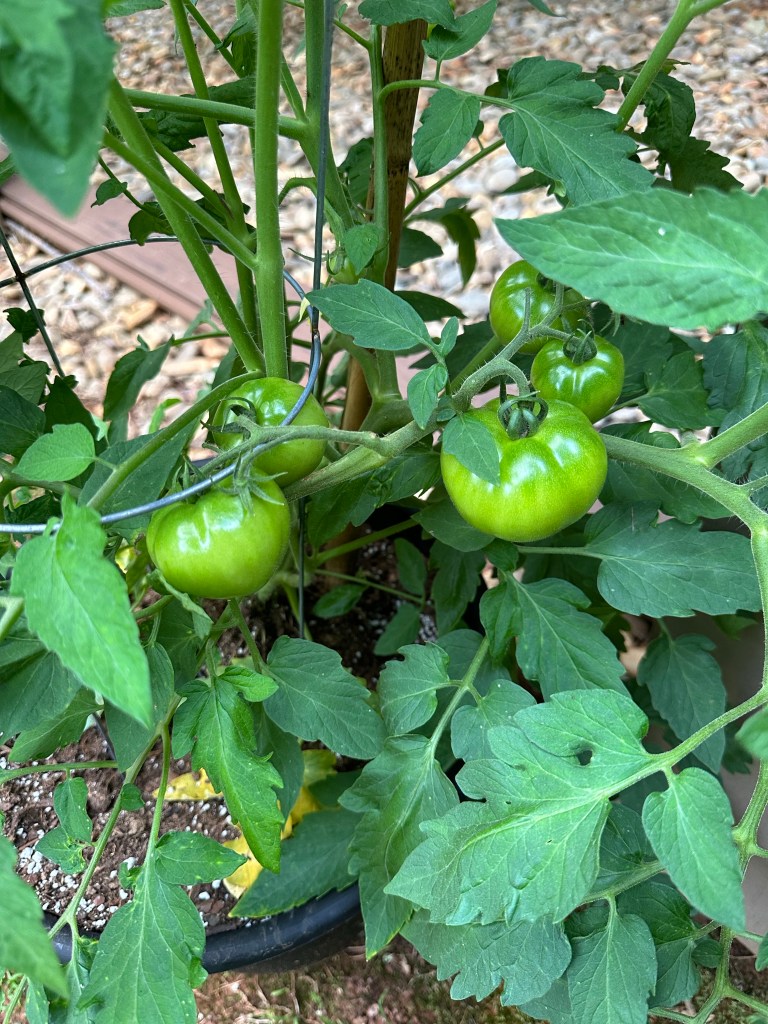 A few weeks ago I bought a tomato plant from the Mennonite market near my house. It is doing great!! It has about twenty five tomatoes on it. They are all green and I can’t wait till they get ripe.