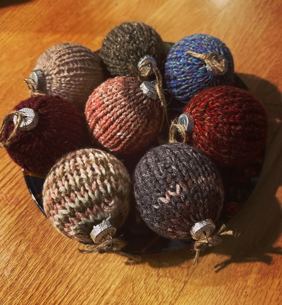 I have been working on these Christmas ornaments for a week. My friend Annie from work sent me a TikTok video on them and I just loved the idea. I bought clear ball ornaments from Walmart. You can get them just about anywhere this time of year. I used double pointed needles size 5 US. It doesn’t take a lot of yarn so this is a great way to use little bits of yarn from previous projects. I cast on 23 to 24 stitches depending on the yarn weight. Leave a long tail when casting on. I knitted a little pouch about 3.5 inches long. You then thread a darning needle and run through the loops on the bottom and pull together. Do the same thing at the top but put your glass ornament in first. Weave in the ends on the top and bottom. They’re so easy and knit up really quick.