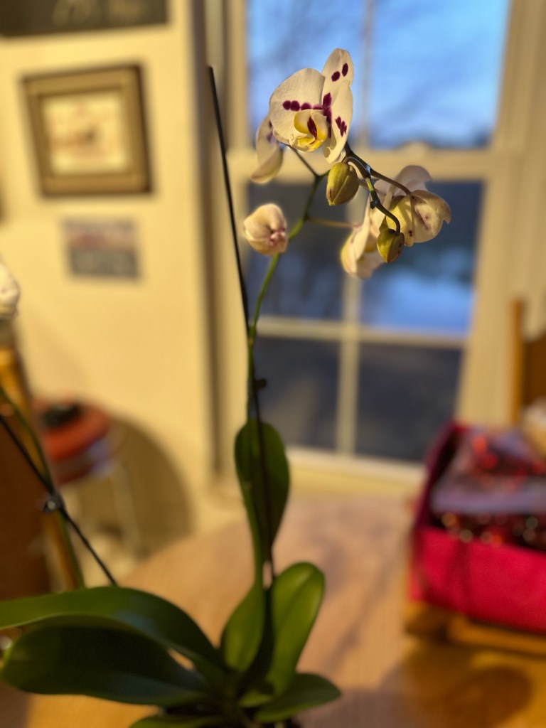 I added a new orchid to the orchid family. Isn’t she beautiful? I named her May Bell. I brought her home and repotted her. She blends in nicely with the orchid family. My husband argues that I have no more room for orchids. But I always find a place.