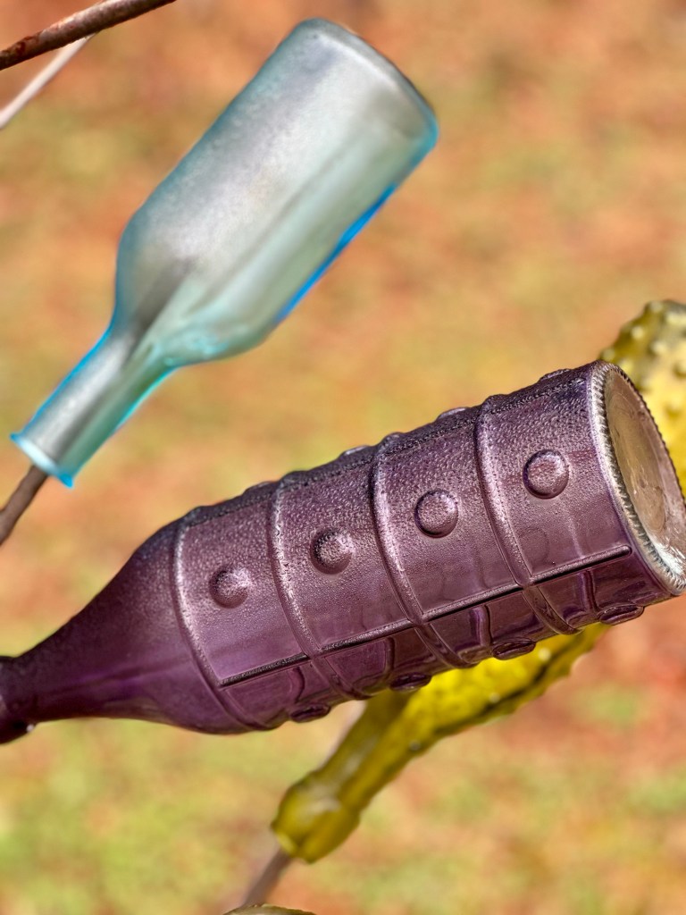 The morning dew on the bottles on the bottle tree are shimmering in the light.