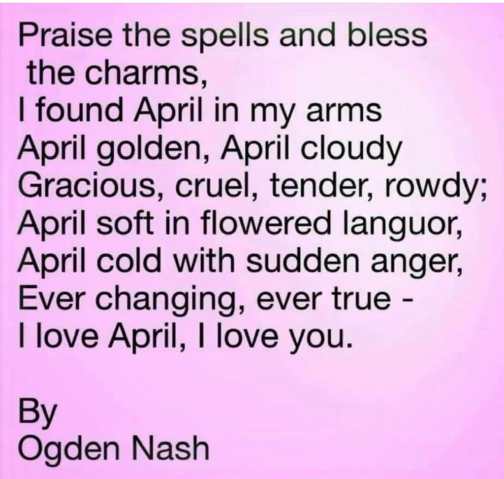 I was thinking about the month of March. It’s hard to believe it has ended for another year. March came in like the proverbial Lion. The weather was terrible the wind was so strong it blew our outside furniture all over the deck. We had tree limbs down and lost power one night for about six hours. We had a hail storm that left our deck littered with hail so thick it looked like snow. And then it, March, went out like a little meek lamb. Goodbye March. Until next year.