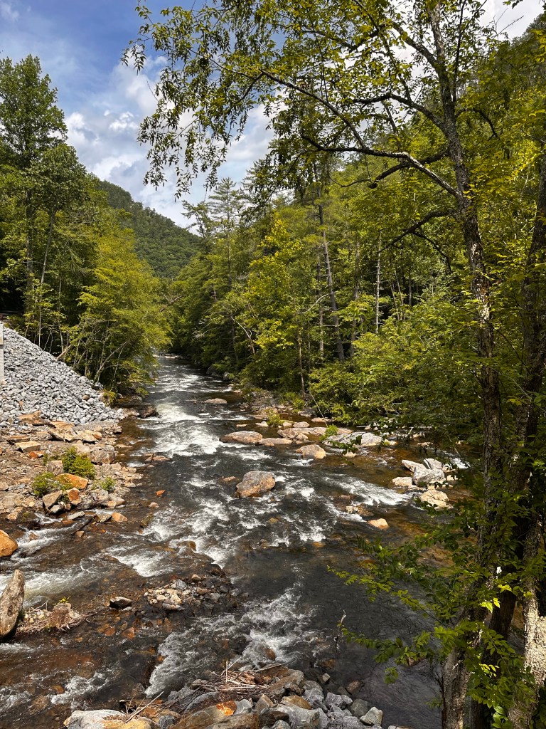 My hubby and I decided to take a little road trip last Thursday. We went into the mountains to look at a local waterfall, Bald River Falls. The road leading to the falls has been closed for over a year so that a viewing bridge could be built. The road opened back up last month and the new bridge was opened. We went to check it out. It was just beautiful. Because of all the rain we have had, the waterfall was flowing fast and hard.