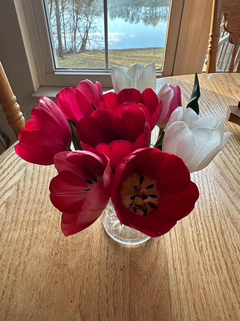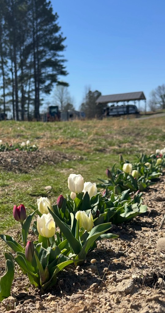 My sister and I visited the cutest farm on Saturday. We have been planning this for a while. The farm produces tulips every year. For about four weeks out of the year you can go there and pick tulips and take pictures and just enjoy the atmosphere and scenic beauty of the farm. It is really quite lovely. We had put off going for more than a week because the owners had reported a very small crop of tulips this year because of the rain and wind. We finally went Saturday, even though the tulips were a little less than what they will be in a week or two, and we had a great time. The weather was warm and so nice. We picked a few tulips. Most of them hadn’t bloomed out. I put them in a small glass dish and they are really starting to open up. We also had lunch and did a little shopping. I ran into a dear friend I hadn’t seen in a while. She recently lost her husband and she and I have been planning to do lunch forever. I made sure I had her number and we will definitely go in a week or two.
