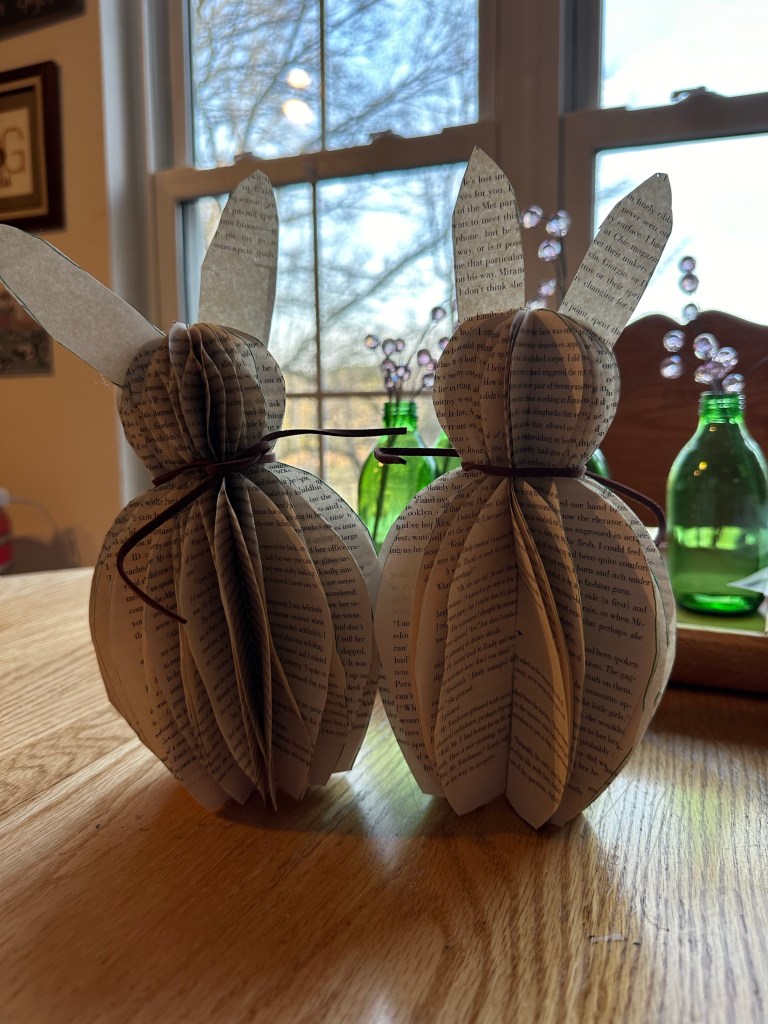 I saw a video on Instagram about making paper bunnies I loved the paper roses I made last week so I decided to do a few of the bunnies for Easter. These are made from pages of a book. I used the old books I bought at the thrift store. I love the way they turned out. I am planning to add a baby bunny.