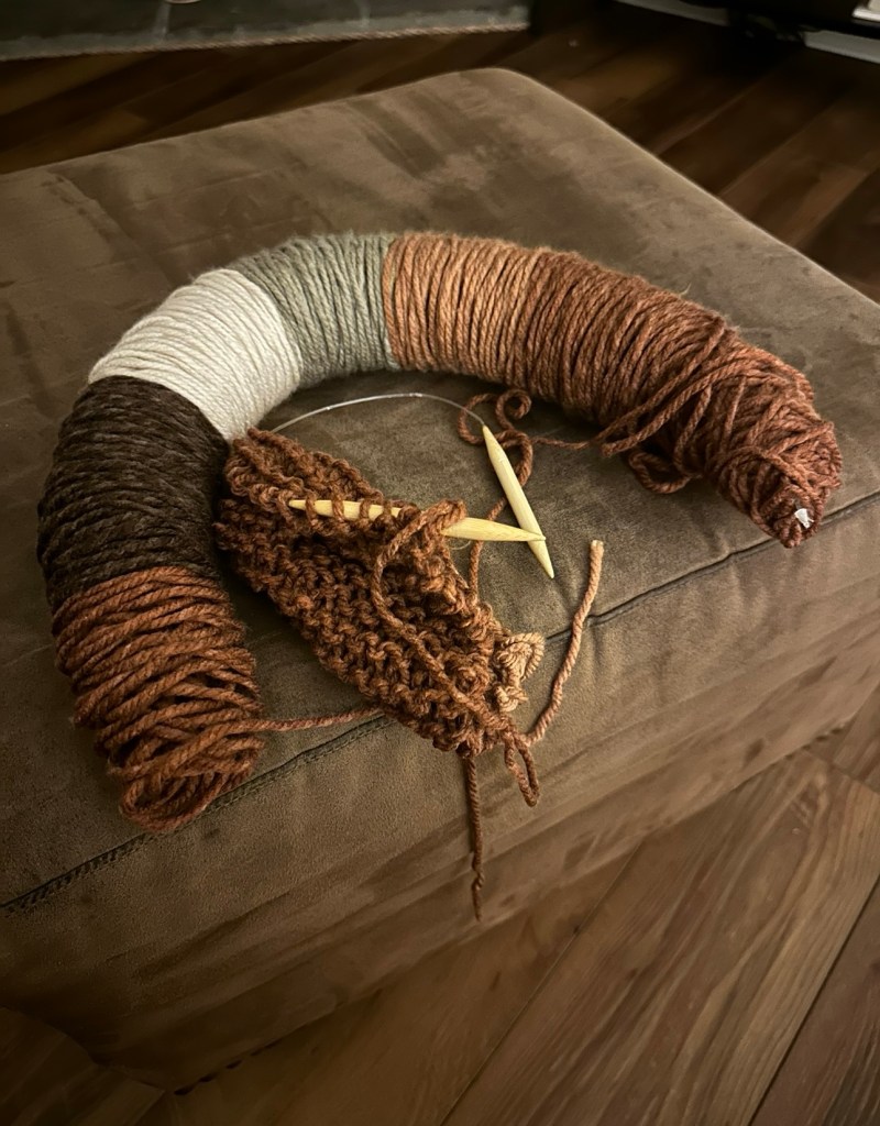 I always take knitting with me. I love these colors. I am making a scarf and some headbands to donate to the cancer office where my sister got chemo this year. They have a little collection table and I put several things out earlier in the year. Everyone loved the headbands. It covers their ears and part of their head and this is really helpful when the weather is chilly but not too cold. I will probably do some toboggans as well for colder weather.