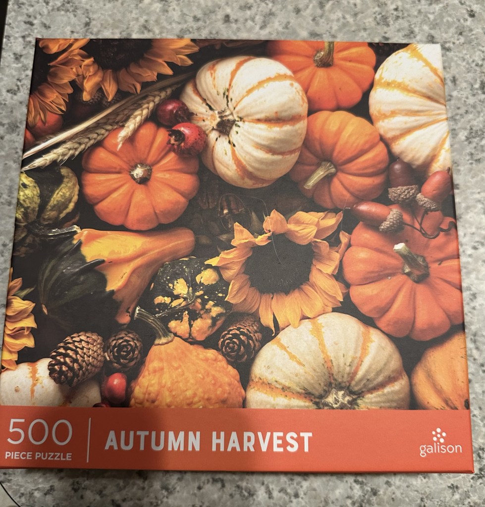 We always take a jigsaw puzzle to work. My sister Sandy and I love these. We bought two at T.J. Maxx on our way in and we picked this one to start with. It was a nice autumn scene.