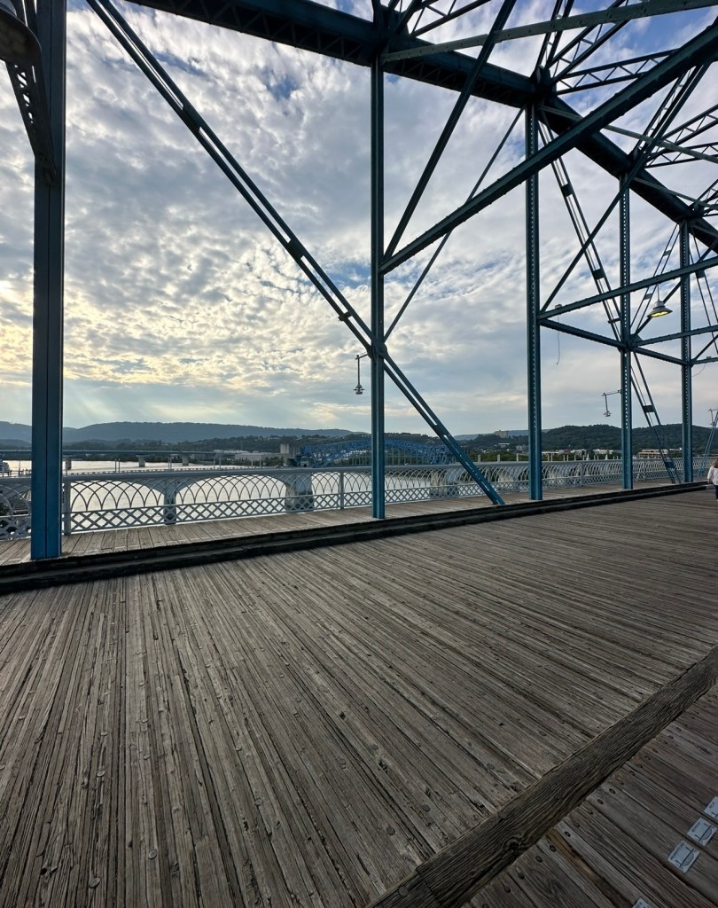 After visiting Ruby Falls and the tree houses at Ruby, I’ll tell you more about those in another post. We went back to the hotel for a quick refresh. We then took the CARTA bus downtown close to the Walnut Street Pedestrian Bridge. The bridge was built in 1890 and is 2,376 feet long. There is no traffic on this bridge other than bicycles, Segways or scooters. And many many people walk across the bridge. The scenery is beautiful.
