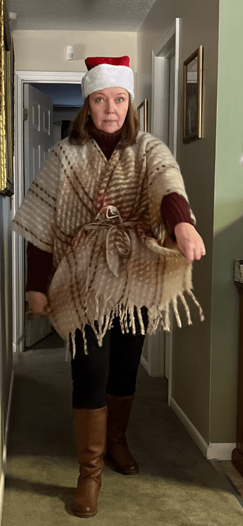 One of my very favorite Christmas presents was this shawl wrap thingy that my nephew and his wife got me. I just had to do a runway modeling of it. The Santa hat and the intense model stare just added to it I think. HA! HA!